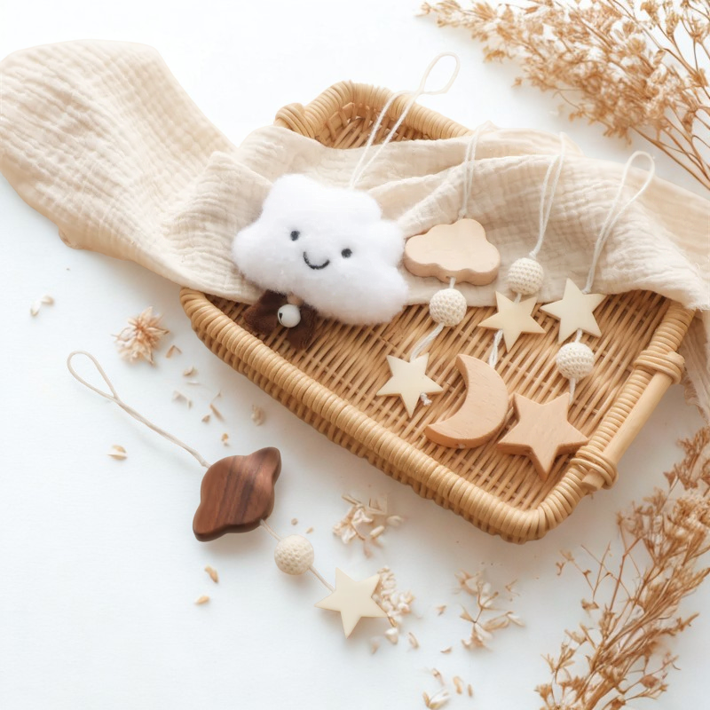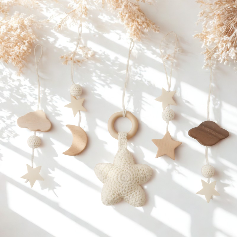 Verwandle den Spielbogen deines Babys in ein kleines Universum voller Träume und Entdeckungen. Unsere liebevoll gestalteten Spielbogenanhänger mit Sternen, Wolken und Planeten regen die Fantasie an und fördern spielerisch die Sinnesentwicklung deines Kindes.